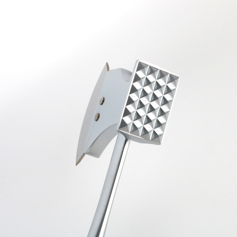 Həm yeni dizaynlı sink ərintisi ət yumuşatma maşını, həm də pizza kəsici kimi xidmət edən hamısı bir yerdə alətin uzunluğu 25 sm-dir. Ön ucu iki funksional səthə bölünür: biri ət yumuşatıcı, digəri isə pizza kəsici üçün. Dəstəyin optimallaşdırılmış qövs forması ilə dizayn edilmişdir və tutacaq hissəsi böyüklər üçün qövsün yanında daha qalın bir plastikdən hazırlanmışdır. da əlavə olunur xurma ağrısını azaltmaq və uzun müddət istifadə zamanı rahatlığı artırmaq üçün sapın quyruğu.